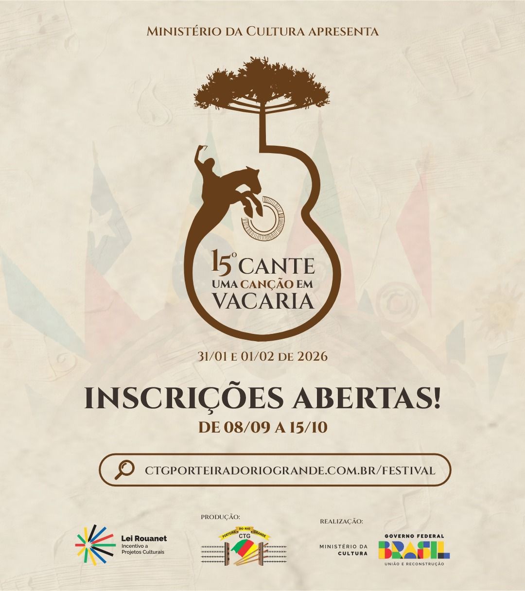 As inscrições para o Festival devem ser feitas através do site www.ctgporteiradoriogrande.com.br/festival até o dia 15 de outubro de 2025.